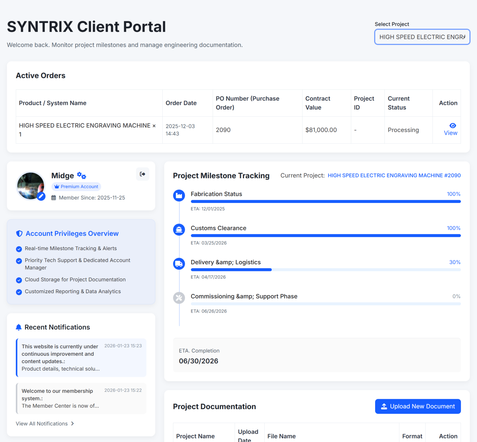 Real-time monitoring of fabrication milestones and logistics for full supply chain transparency.